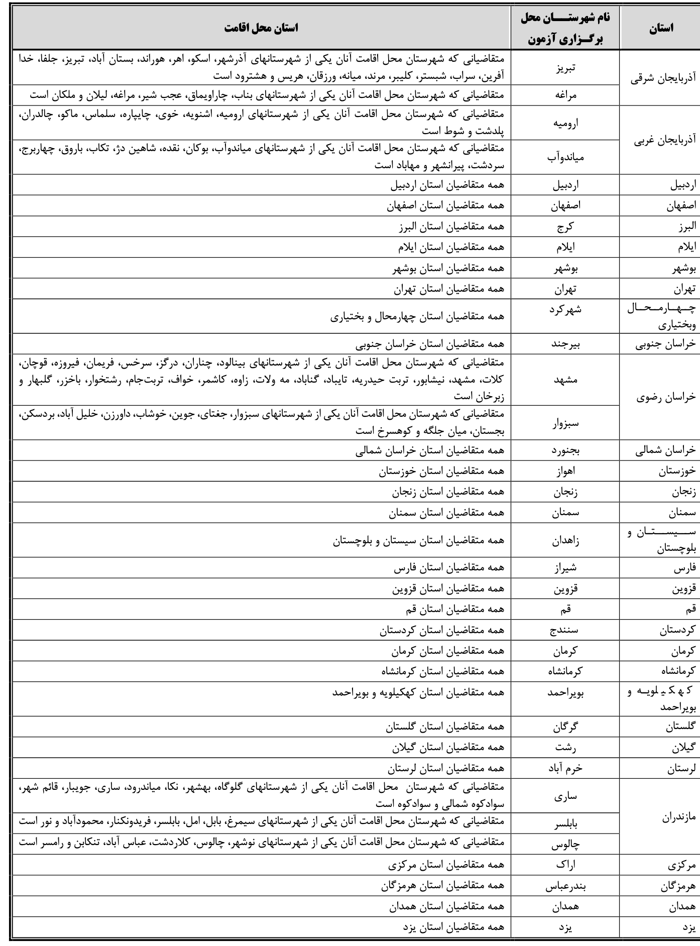 «آزمون وکالت 1404» در ۳۶ شهرستان کشور برگزار میشود. بر اساس جدول منتشر شده، شهرهای محل برگزاری آزمون و حوزههای امتحانی داوطلبان هر استان به شرح زیر است:
