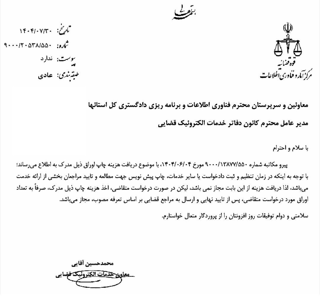 معاونت خدمات الکترونیک قضایی: دریافت «هزینه چاپ پیشنویس» دفاتر خدمات قضایی (جهت مطالعه) ممنوع است. اخذ هزینه فقط برای چاپ اوراق نهایی به درخواست متقاضی مجاز است.